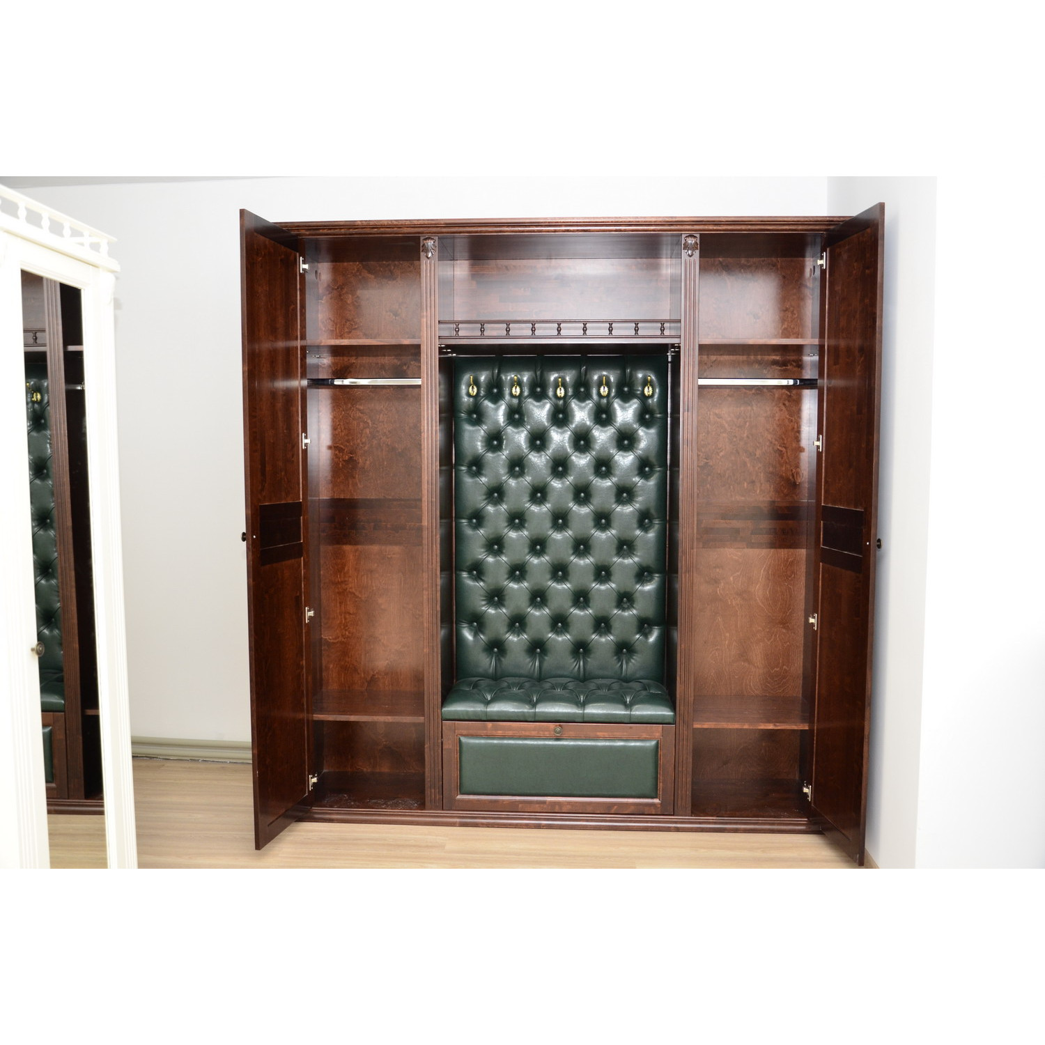 Деревянная Прихожая 001 с каретной стяжкой выполнена из массива сосны,в данной модели вы можете самостоятельно указать цвет дерева и экокожи,а так же материал,выбрав соответствующую опцию.