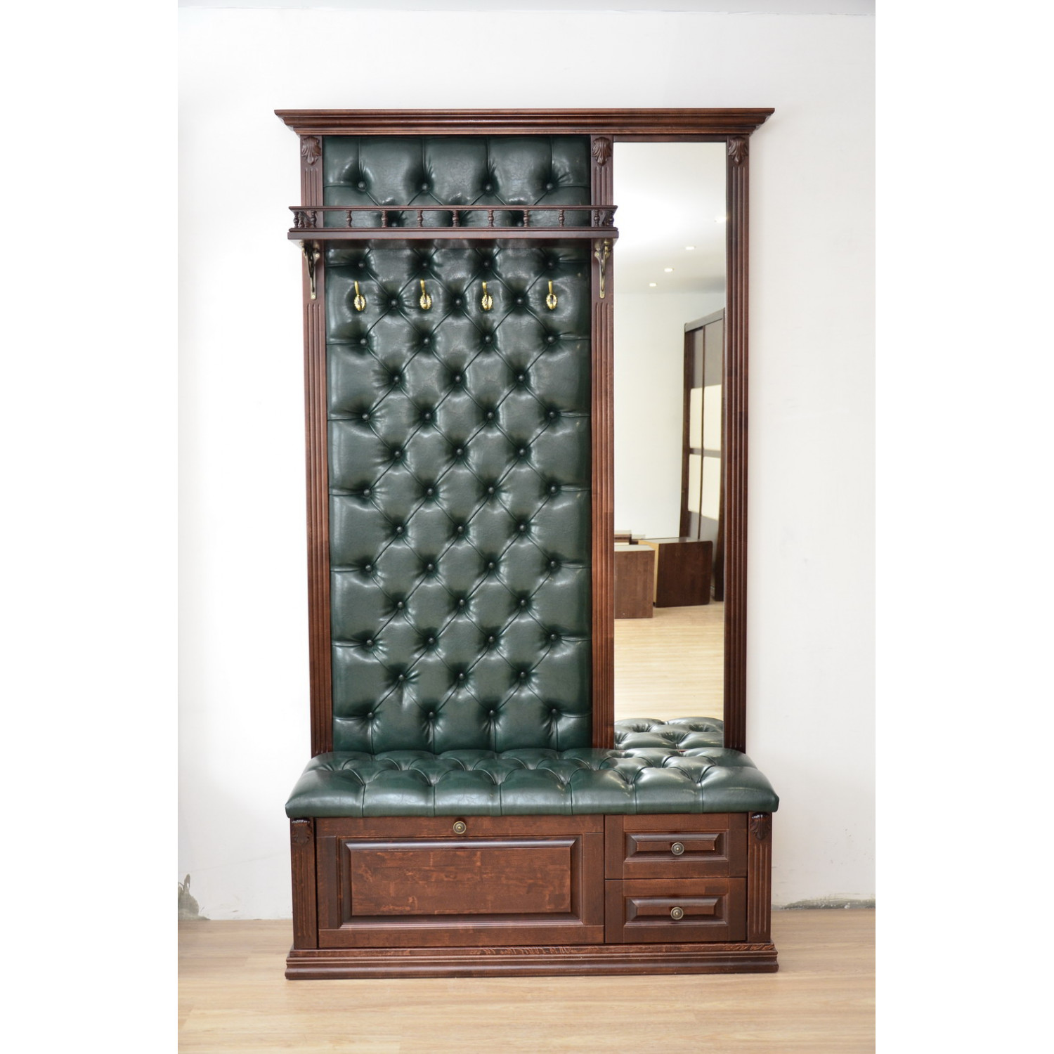 Деревянная Прихожая 009 с каретной стяжкой выполнена из массива сосны,в данной модели вы можете самостоятельно указать цвет дерева и экокожи,а так же материал,выбрав соответствующую опцию.
